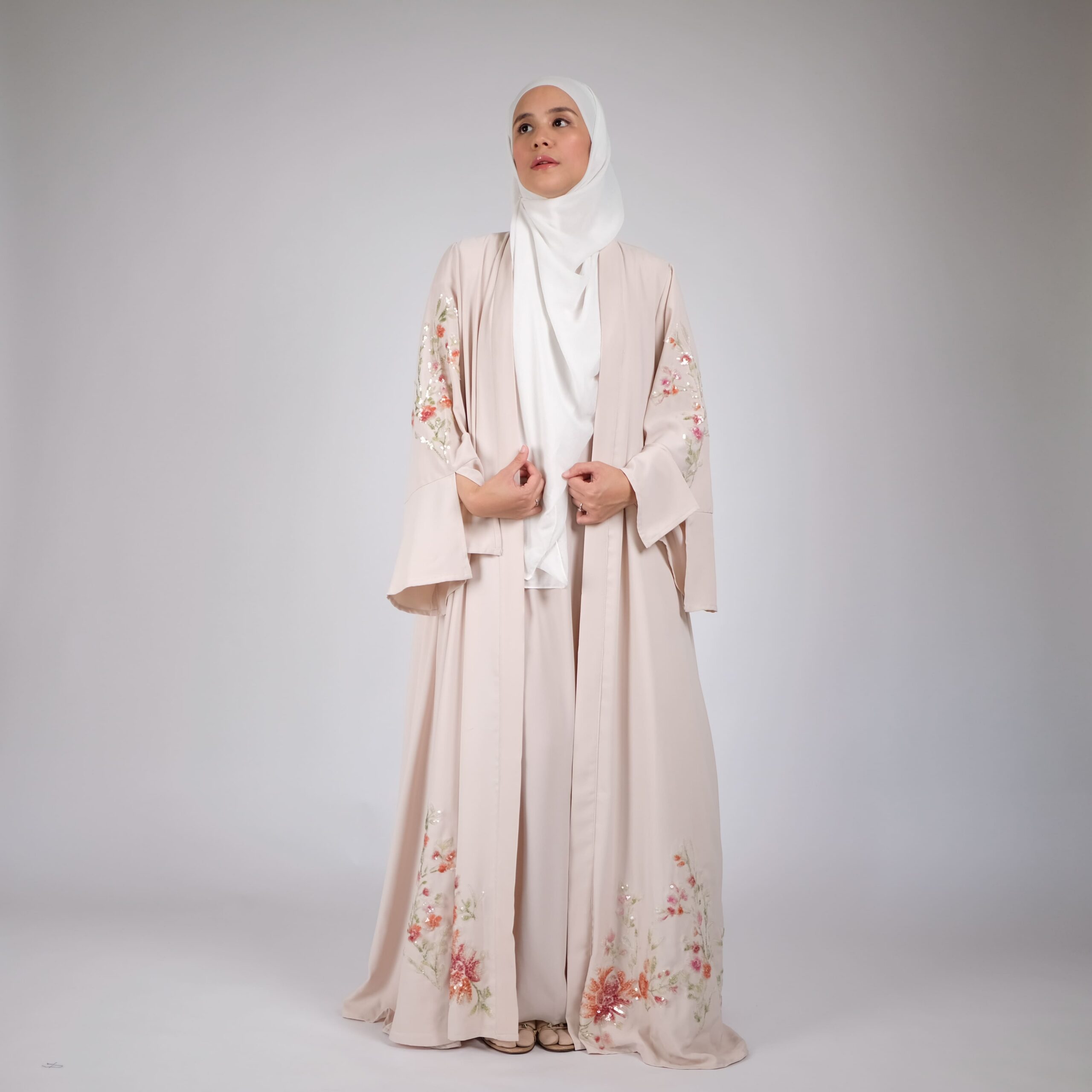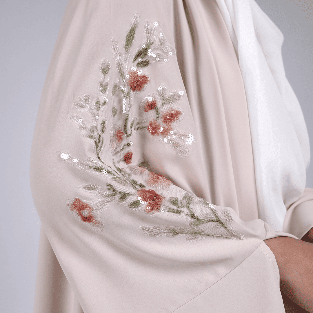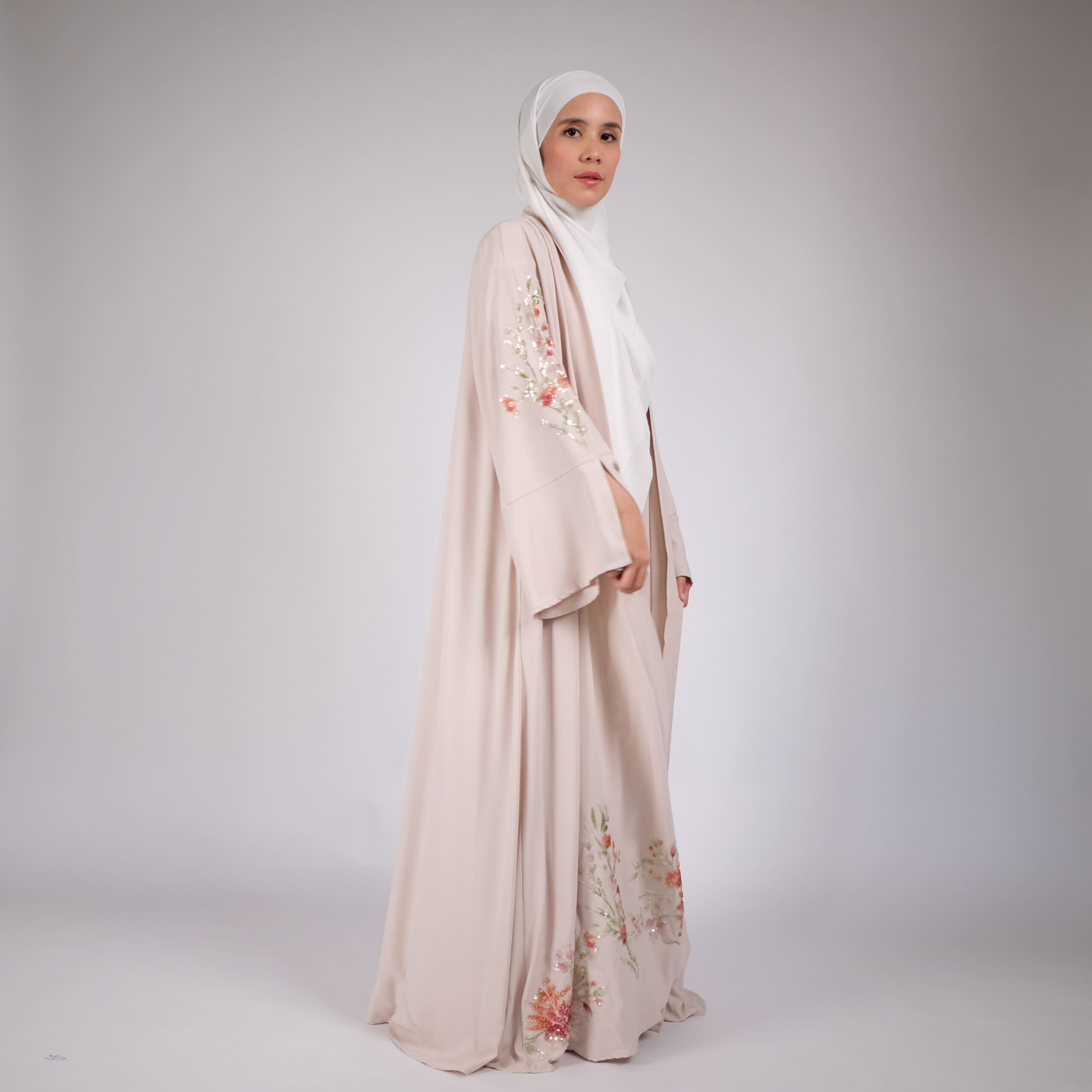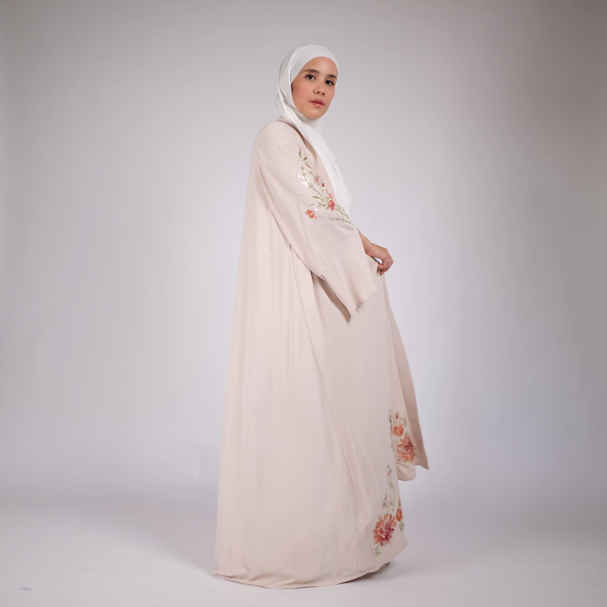 Dreamy Blush Abaya Fabric: Airtech in a soft blush pink shade, light and breathable Detail: Intricate beaded embroidery placed gracefully along the lower part for a subtle yet elegant finish Model: Outer abaya with rounded neckline and front buttons, comes with matching inner. Available in S/M & L/XL